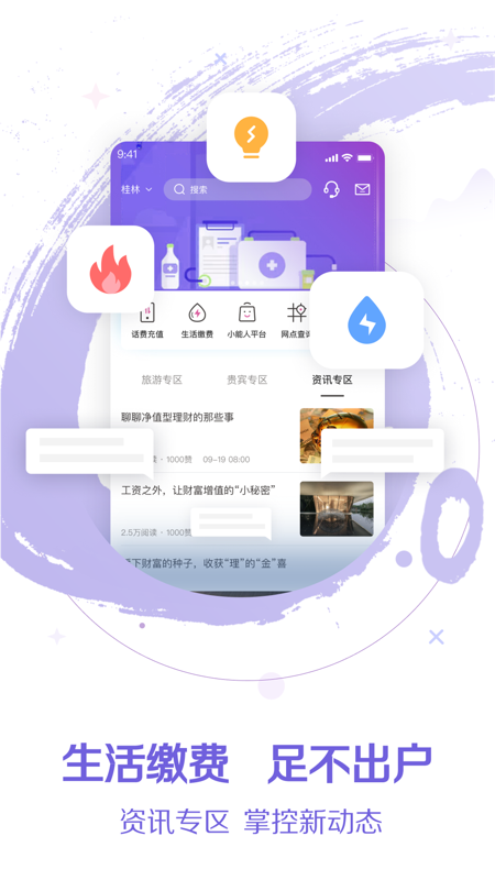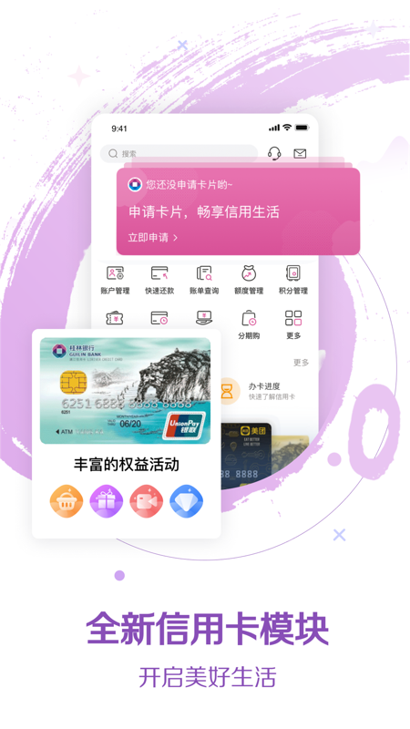 桂林银行手机银行6.0焕新升级,重塑五大板块,全新“我的首页”,新增信用卡频道,智简的交互模式和业务流程,扁平化的设计 ,为您打造更便捷、更安全、更智能的移动金融体验。