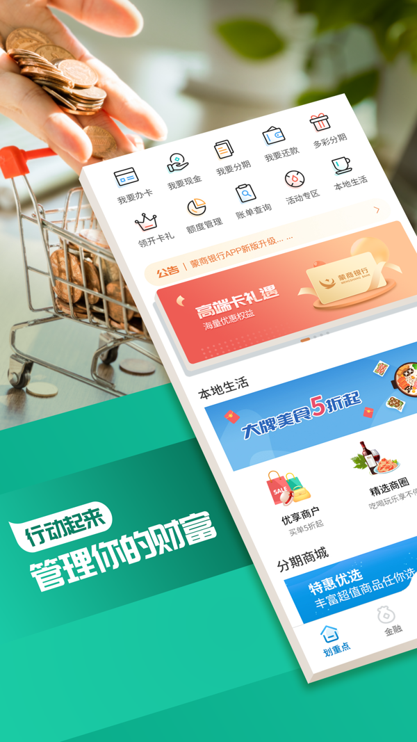 APP介绍:1. 界面友好,菜单清晰操作方便!2. 尊贵持卡,个人权益迅速查询!3. 生活服务,全面覆盖应有尽有!4. 积分换礼,超多组合超值换购!5. 信用服务,办卡查账额度还款!6. 好用可靠,多重保障数据加密!7. 金融理财,轻松理财以财生财!8. 在线办卡,只需轻松几步搞定!9. 一元停车,活动多多请好吧您!10. AR识别,让你的信用卡活起来!