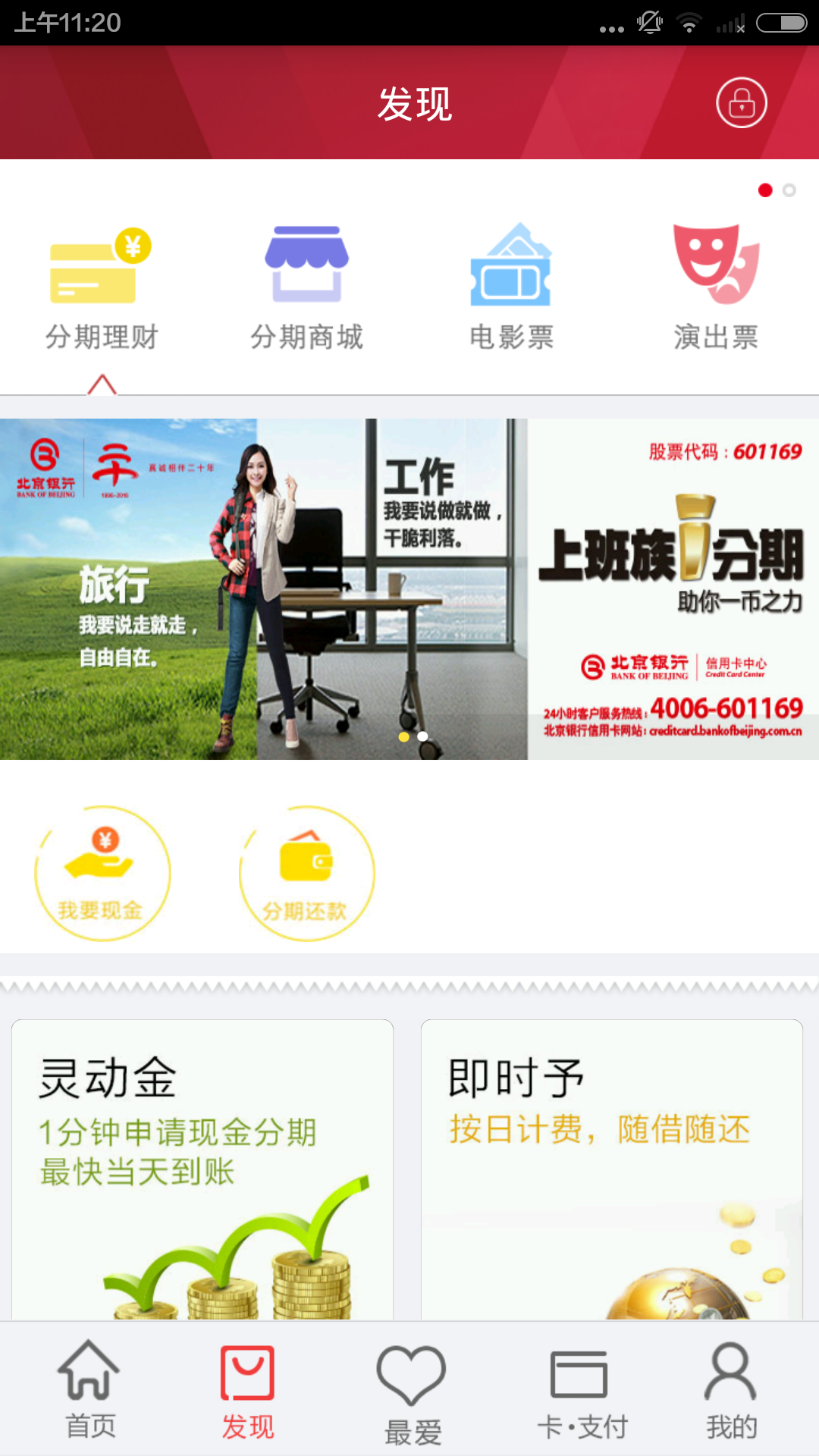 2.“发现”:分期理财,积分,演出票,分期商城,电影票…让您在使用中发现更多的优惠信息,并提供给您优质的使用体验