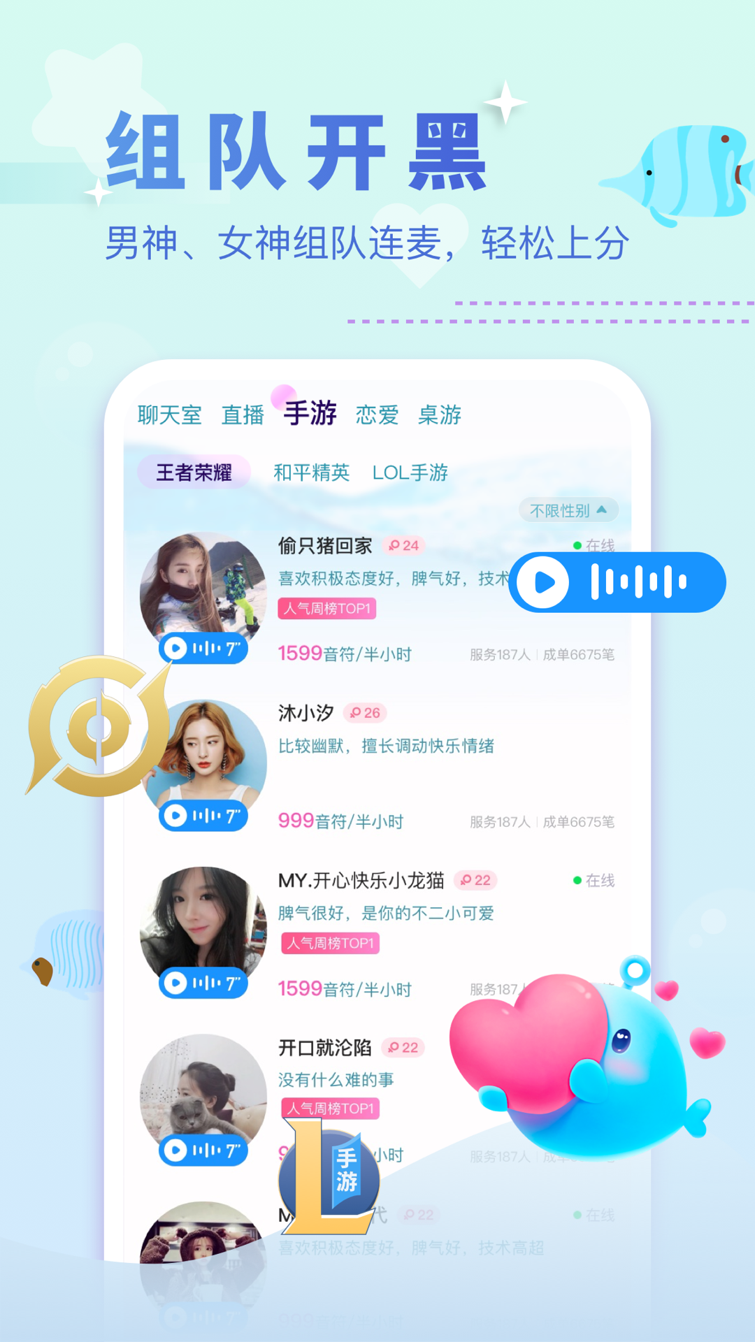 2.作为语音工具,双鱼提供语音聊天、连麦开黑、直播娱乐、休闲游戏等多种互动娱乐场景,上双鱼,随时有玩伴!