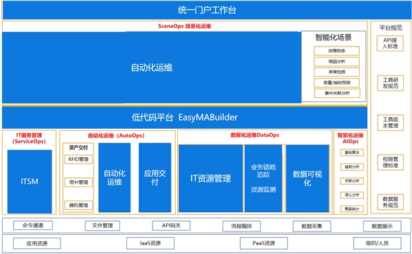 同时,随着各类运维平台不断增加,致使用户使用成本也不断提升、也为各类运维工作的开展增加了额外的复杂度。为此,联盟在全面完成了对IT资产的梳理和纳管后,于2020年启动了运维整合平台项目,该项目以CMDB为基础针对运维工具进行专项治理,构建运维一体化整合平台,助力标准化、自助化的运维场景落地,打破运维系统孤岛现状。
