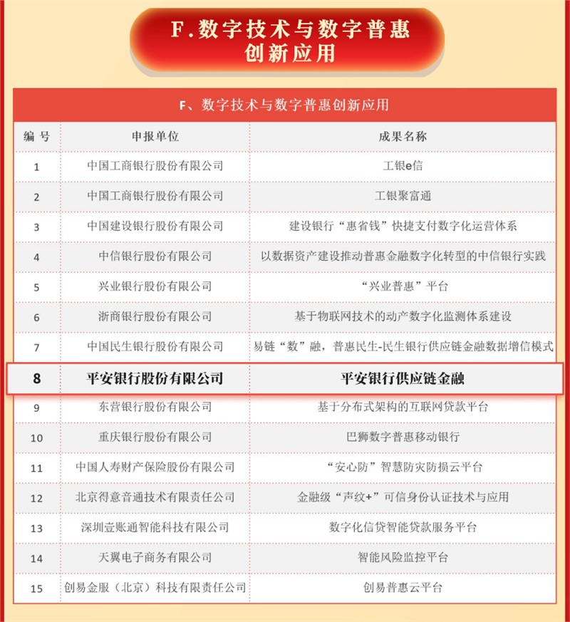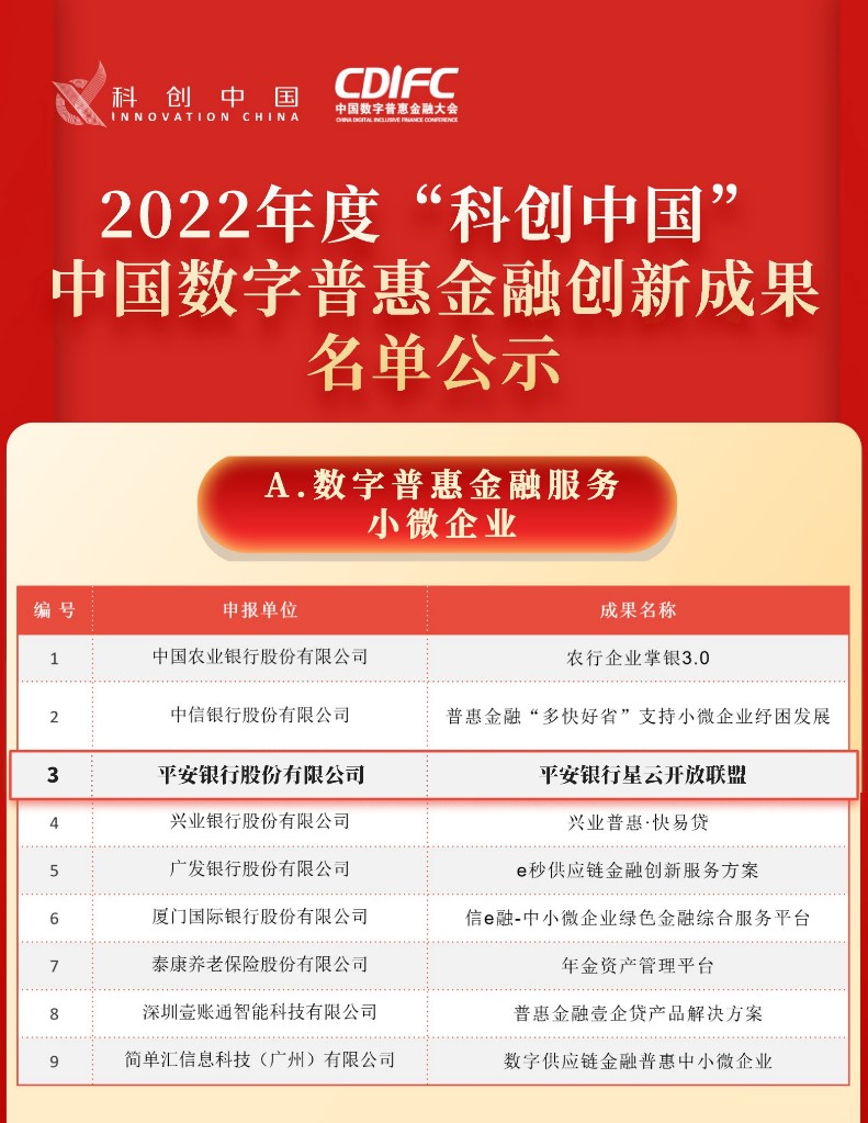 此次两项中国数字普惠金融创新成果的入选,代表着专业机构和市场对平安银行的认可,也是对其在科技赋能金融数字化转型、以开放生态服务实体经济发展方面的充分肯定。